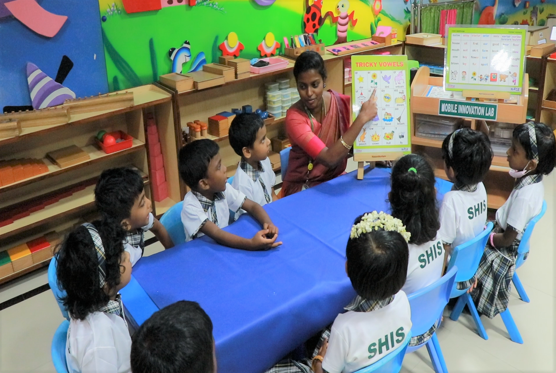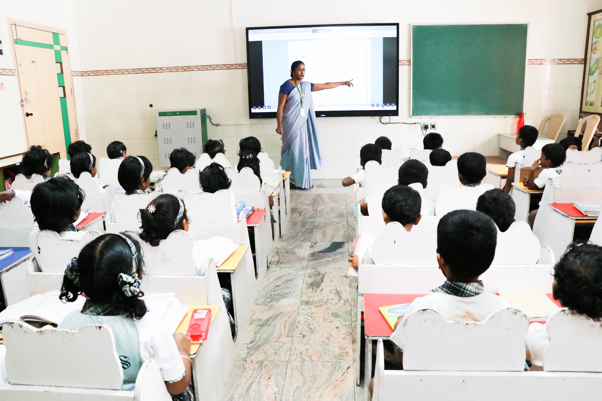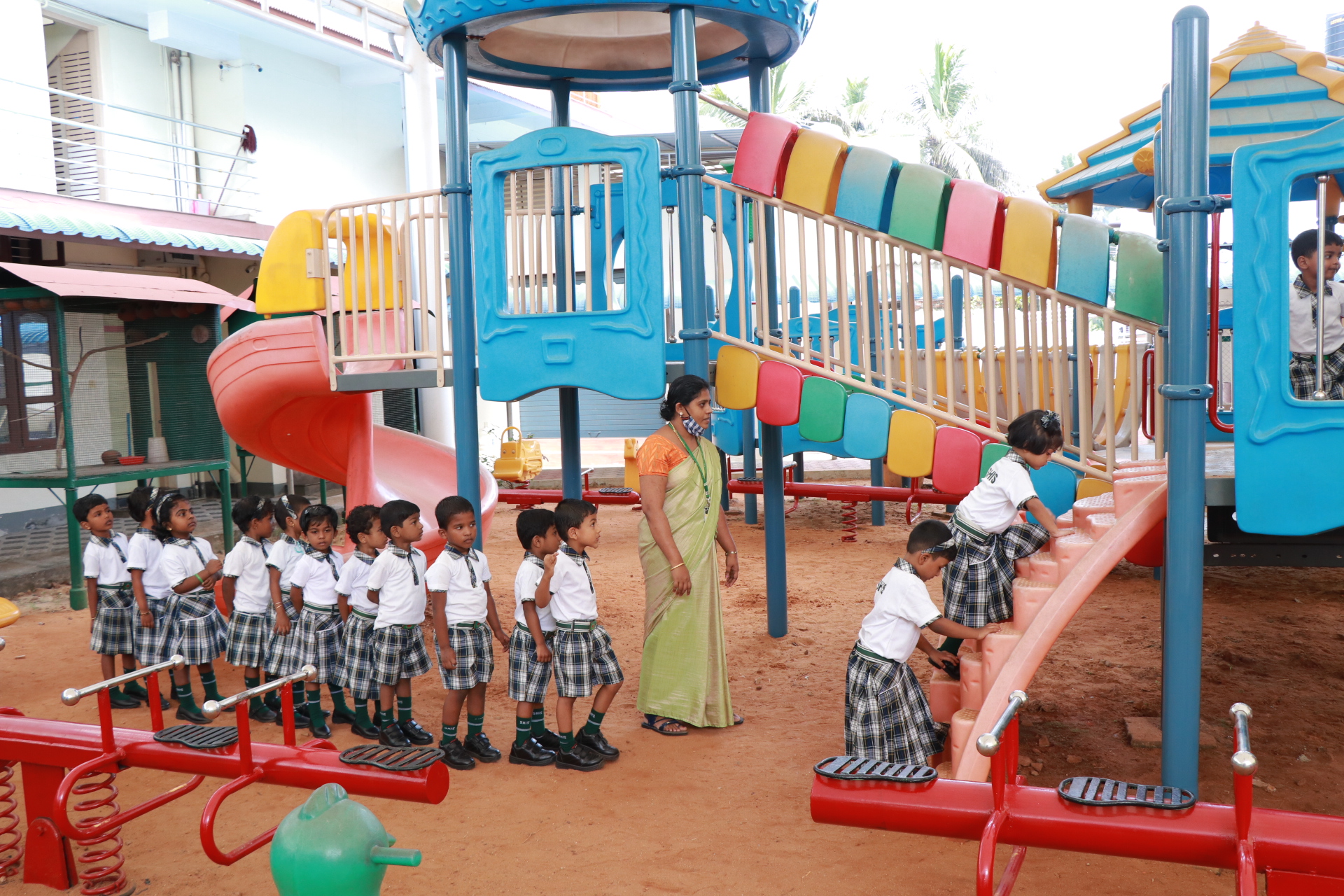 Spacious classrooms with proper ventilation and a child centered approach to early education and more conducive to interactive, hands- on learning. Classrooms are equipped with LED Interactive board which has revolutionized the teaching methodology in Kindergarten. Age appropriate teaching aids and all the necessary materials made available in the class itself. There are two teachers in every classroom to reach out all the children, assisted by motherly care takers in all the classrooms. All the classrooms are under CCTV surveillance in order to ensure the safety of our children.